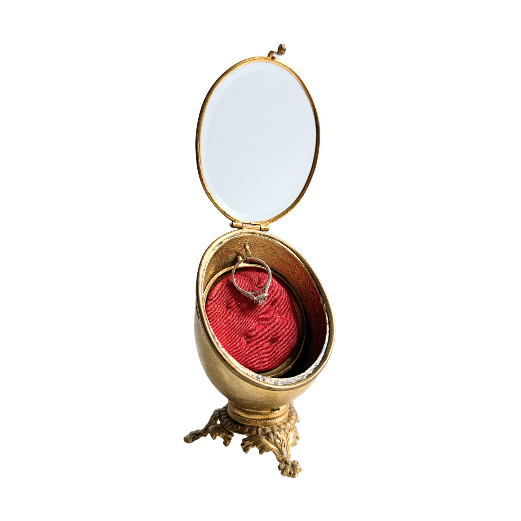 French antique pocket watch casket from the late 19th to early 20th century. Made of gilt metal with a beveled glass front. No chips or cracks. Red fabric is newer.